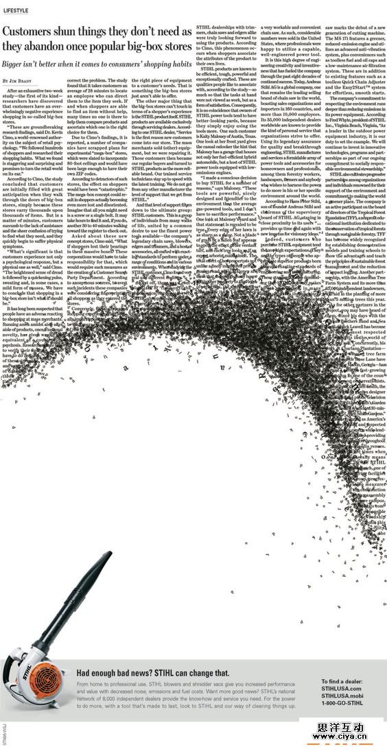 看到这个伟大的报广,小编专门去搜了一下Stihl这家公司。主要经营的是老外常用的修整花园的工具。看完了是不是有冲动想把所有的杂物灰尘统统吹走的想法,没错这是一家做户外植被修剪清理的公司。字符和枯树叶皆逃不过他的大功率吹风机,idea选的好设计师自然能省事的创造出来经典。
