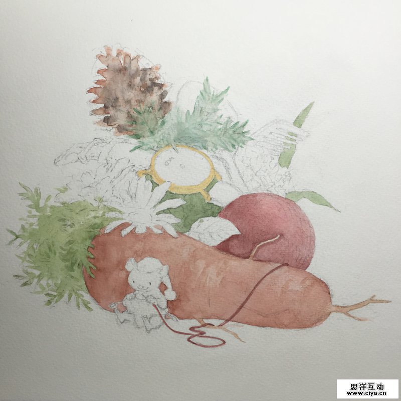 4.这样的画面氛围适合有一朵康乃馨,加上一朵紫色的康乃馨,然后开始刻画手表。