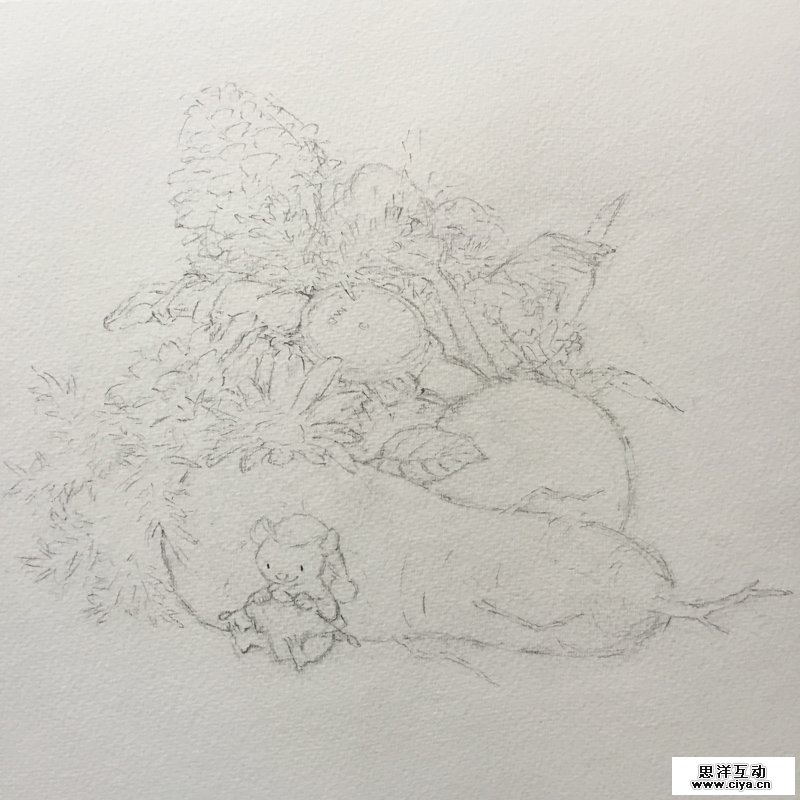 6.手表画好之后,刻画后面的松果和松针,注意松果上一片片的体积关系,松针也不要过于密集。