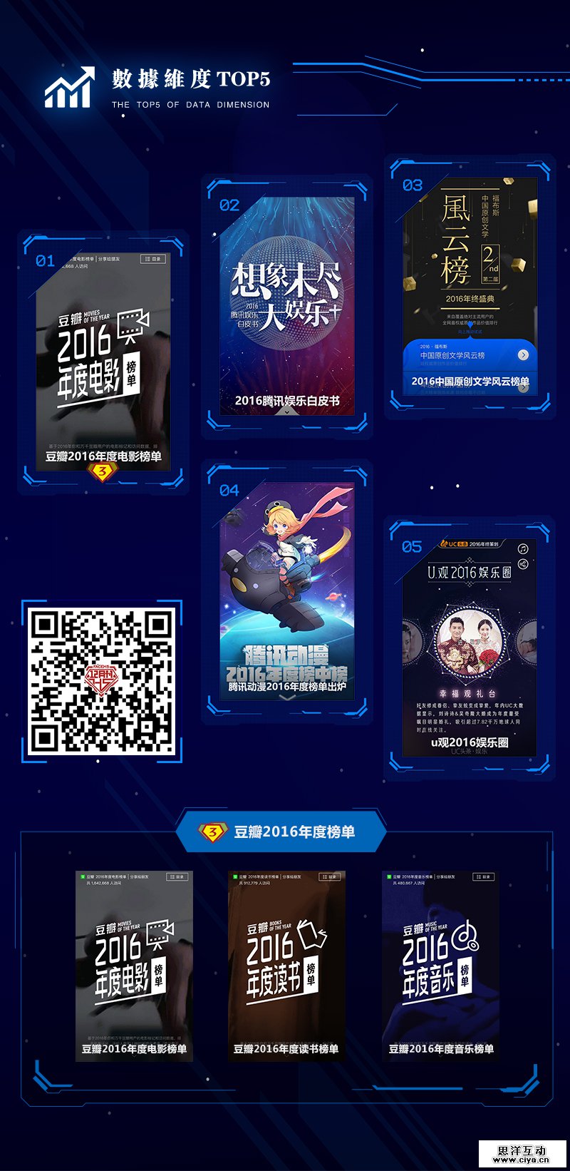 而十大维度上榜的50个优秀H5案例中:腾讯16个、阿里13个、网易9个,三巨头合计占比达76%。