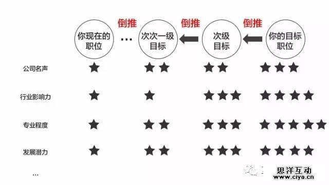 即从你的目标开始,依次往前倒推。比如你的终极目标是成为知名公司A的市场总监,那么倒推找到这个目标的次级目标,即你要先成为一名在A公司或比A公司相对名气小一点的B公司的市场经理;再往回推一个目标,即你要更先成为一名在B公司或比B公司相对名气小一点的C公司的市场执行...每一次倒推都在公司名声,专业度,行业影响力,发展潜力,薪资水平等方面降低一个或半个等级,直到推演到你现在的职位为止。这个规划方法的优势在于,始终以目标为出发点,围绕着目标去不断进行拆解,从而找到最适合现在的努力方向。