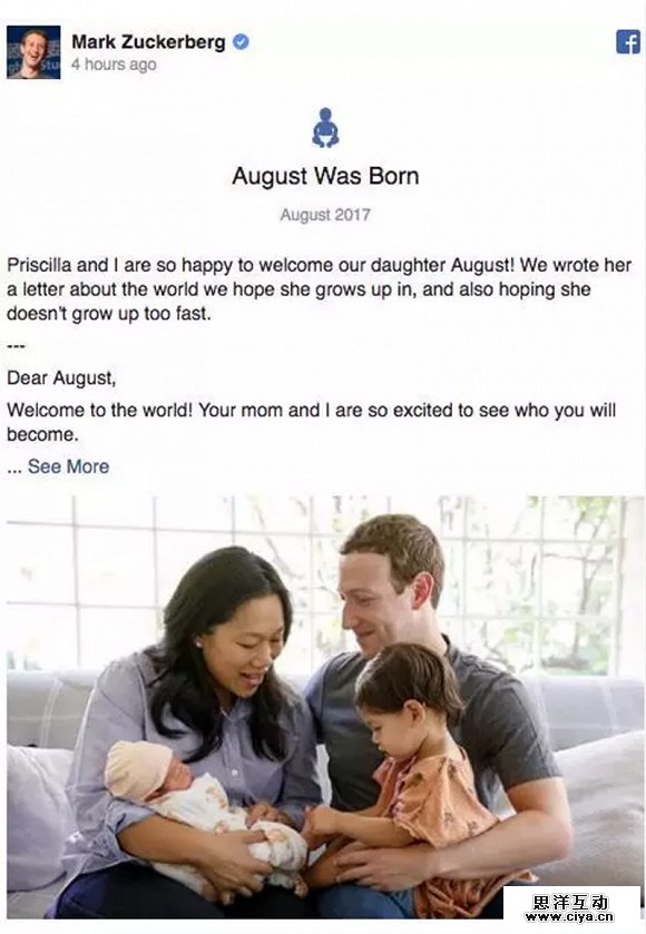 扎克伯格在8月28日这天迎来了自己家庭中第三位女人——小八月。而18个月前,扎克伯格才迎来大女儿Max。