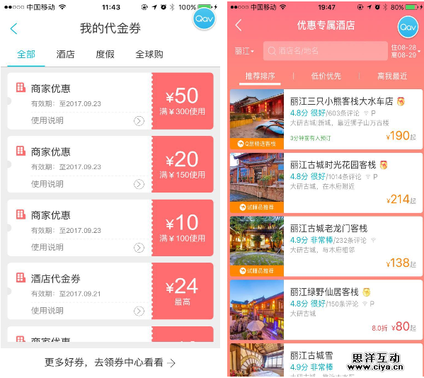 去哪儿网酒店频道的商家优惠券,类似于天猫的店铺券,也是限制使用范围,当点击立即使用的时候,跳转到是一个粉红色与去哪儿app风格不一样的专属list页面,这些页面展示了可使用商家券的酒店,试想,商家看到这样的展示方式,肯定愿意做出商家优惠来赚取足够的流量,这种设计方式达到的效果的双赢。