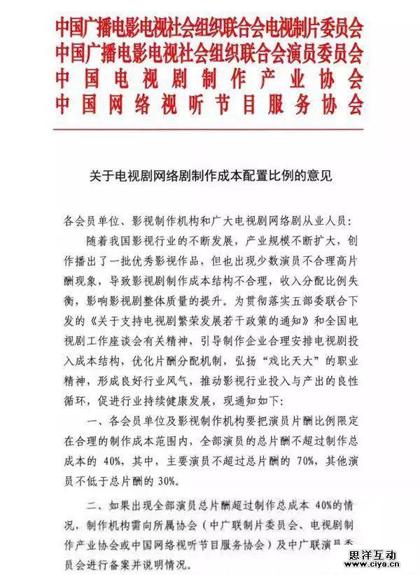一是要求各会员单位及影视制作机构把演员片酬限定在合理制作成本内,全部演员的总片酬不超过制作总成本的40%,其中,主要演员不超过总片酬的70%,其他演员不低于总片酬的30%。