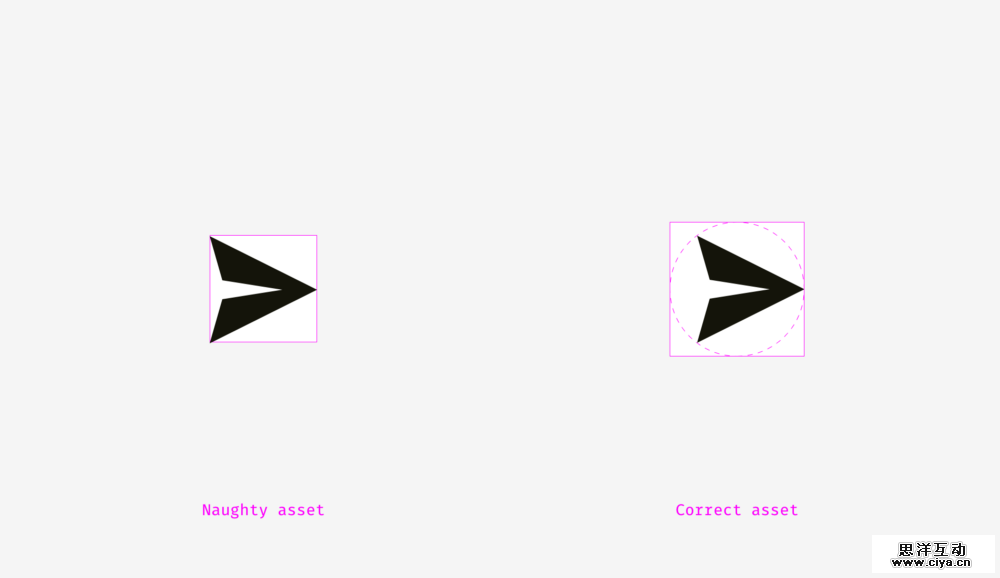 可能你已经注意到上图左边的按钮看上去不太对劲。这是因为不同的对齐方式引起的。第一个按钮把三角形的图标当成了矩形。在某种程度上它是对的,因为当你把SVG或PNG格式的图标发给研发时,研发会把它放在一个正方形的区域里。而第二个按钮在放置图标时保证图标每个角到圆形按钮边缘一致。如下图所示。