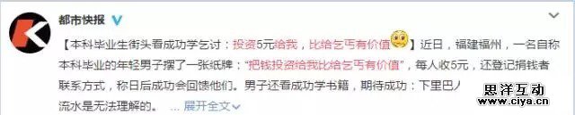 近日,在福建福州,一名自称本科毕业一年的年轻男子在天桥上摆了一张纸牌:“把钱投资给我比给乞丐更有价值”,每人收5元,还登记捐钱者联系方式,称日后成功会回馈他们。