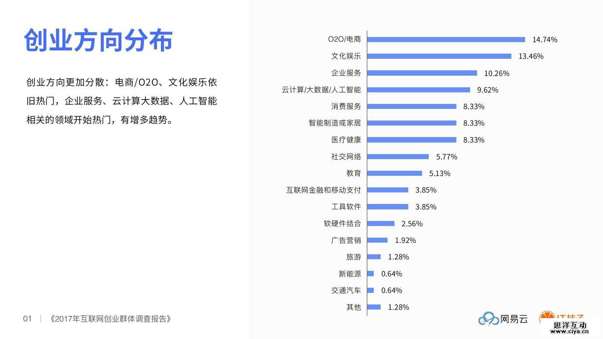 2017 年的创业方向更加分散:电商/O2O、文化娱乐依旧是热门行业,企业服务、云计算/大数据/人工智能相关领域开始热门,有增多趋势;