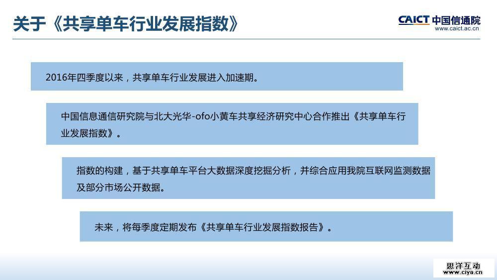 2017年12月17日,中国信息通信研究院与北大光华-ofo小黄车共享经济研究中心在“2017首届共享经济改变中国高峰论坛”上联合发布共享单车行业发展指数,该论坛由国家发展和改革委员会城市中心综合交通规划院等机构联合主办。会上,中国信息通信研究院政策与经济研究所发展与经济研究部主任韦柳融发布了《共享单车行业发展指数报告(2017年第三季度)》。