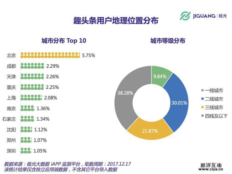 根据极光大数据的统计显示,趣头条用户中 30 岁以下的青年人和年轻人占 69.4%,而作为一款新闻阅读类客户端,趣头条的女性用户高于男性。而在地域分布上,二、三、四线城市的用户合并占比超过 90.15%。