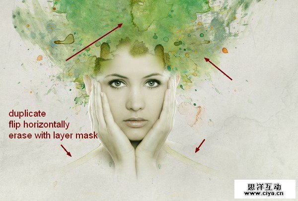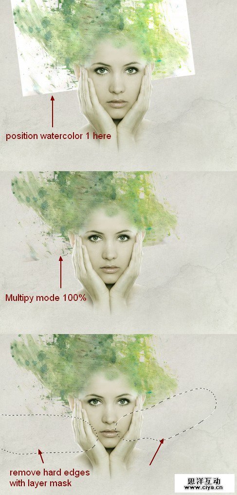 在这一步中,我们将要在主体头部左侧添加一个彩色的水彩纹理,不过比刚才的位置要低一些。一样的,混合模式设置为 正片叠底 100%,再利用图层蒙版去掉不需要的区域: