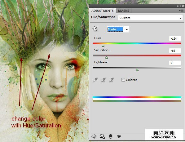 在这一步中,我们需要改变图片的颜色。点击 图层→新建调整图层→色相/饱和度,具体设置如下图:
