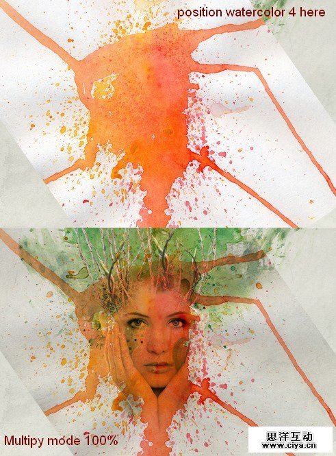 现在我们将会添加另一个水彩图像至主体头部左侧,仍是将混合模式设置为 正片叠底 100%,并去掉不需要的部分: