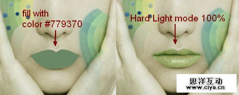 创建一个新的图层,并选中嘴唇区域,用颜色#779370填充,将混合模式设置为 强光 100%。
