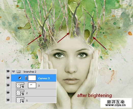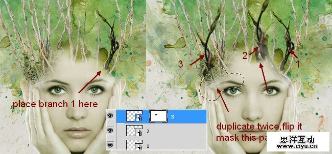 打开图片树枝2。把图示部分抠出后,放在主体头的右上方,再复制两次,并命名为1、2、3。将名字为2和3的树枝水平翻转,并将它们放在主体头的周围。再一次利用图层蒙版来使树枝和头部融合: