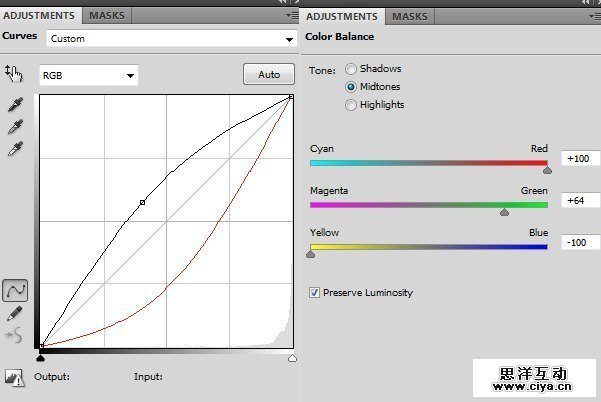 我将会使用曲线和色彩平衡调整图层(勾选 使用前一图层剪切蒙版)来调整前一步中的水彩效果: