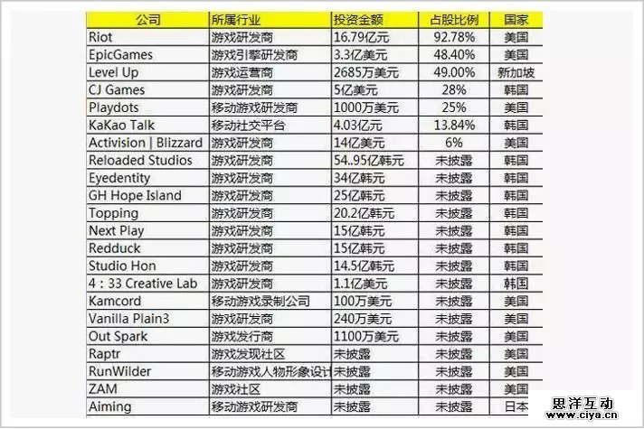 ▲近几年腾讯在游戏和社交领域的部分海外投资
