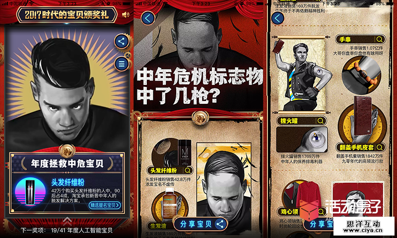 淘宝的「2017时代的宝贝颁奖礼」,将2017年淘宝上购买率最高的商品进行了盘点,带领用户进行了一场年度狂欢,多变的二级页面也如同彩蛋一般,不仅令用户嗨得更开心,还提高了商品的购买转化。