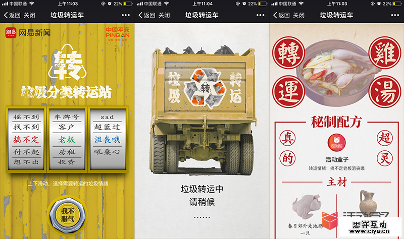 网易新闻客户端根据热点和年轻人喜自嘲的特性,策划出了「垃圾转运车」活动。活动由中国平安和网易新闻联合举办,由一组线上短视频搭配H5页面引爆。