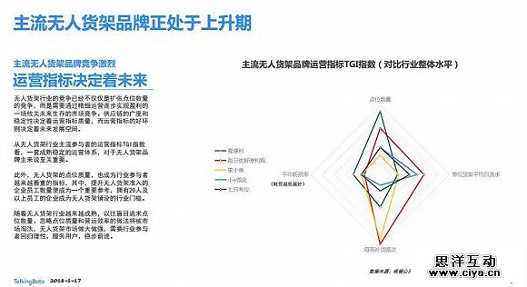 不过,激烈的竞争同样存在,白皮书显示,以市面上主流的无人货架品牌运营指标TGI指数来看,猩便利、每日优鲜便利购、果小美、小e微店、七只考拉的较量集中在点位数量,平均损耗率、每周补货频次、单位货架平均日流水等几方面。由此可见,无人货架的博弈已经不是单点博弈,而是全方位的综合实力比拼。