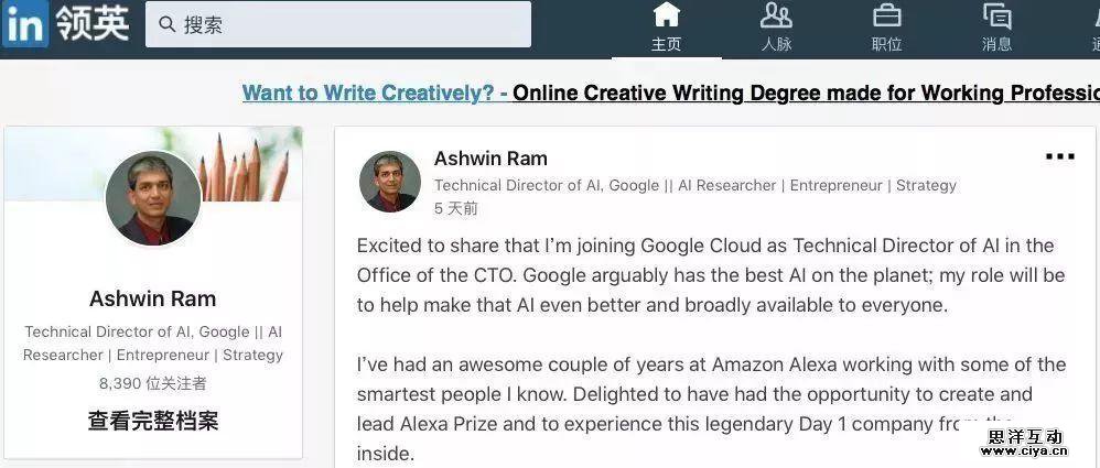 亚马逊和谷歌的战争不仅限于产品,还有人才。近日,亚马逊就遭谷歌挖了墙角。2月28日,亚马逊Alexa人工智能高级研发经理Ashwin Ram在公司任职两年之后,跳槽到了谷歌,根据Ashwin Ram的领英个人资料显示,目前已经成为了谷歌云技术人工智能技术总监。