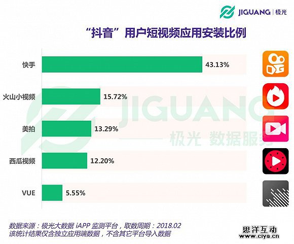 应用重合度数据显示,截至今年2月份,在抖音用户中渗透率最高的同类应用是快手,有43.13%的抖音用户同时在设备上安装有快手应用端。同属今日头条旗下的火山小视频在抖音用户中也有着较高的渗透率,达到15.72%,而美图公司旗下的美拍则为13.29%。