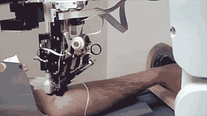 此外还会通过超音波检验血管是否够大,是否有足够的血流通过。机器人会校准针头,将针头插进血管中抽血,整个流程大概只花一分钟。医护人员只需要更换搜集血液的试管。