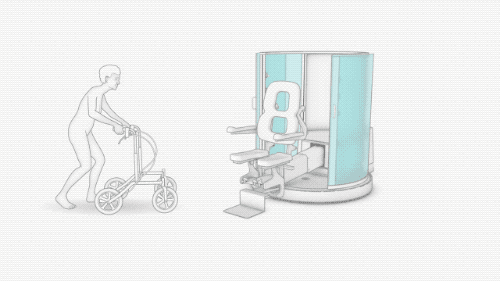 就这样,一个瑞典公司 Robotics Care 专门为此设计了一款能坐着洗澡的全自动智能淋浴房,名字叫做Poseidon。