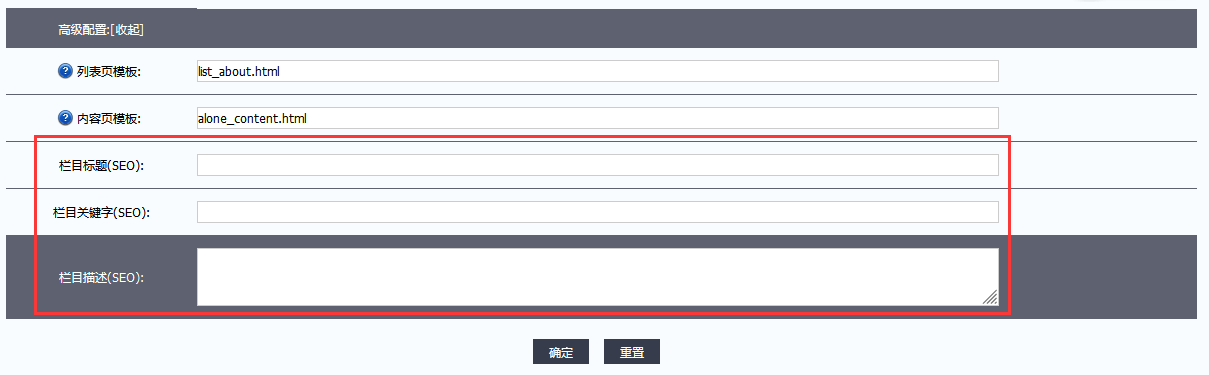 4.修改栏目标题(SEO),栏目关键字(SEO),栏目描述(SEO),修改后点击最下方【确定】保存。