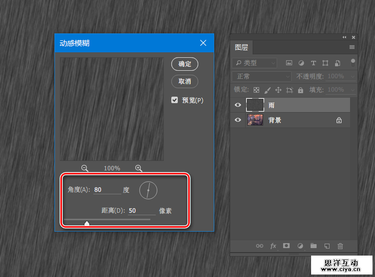 第四步,播放动作。以上都是“前戏”,马上进入“高潮”,如图所示的,在选中背景图层的基础上,打开动作预设,点击“播放”即可。在动作运行的过程中,会先后弹出两个对话框,如图所示,两个参数值一个是控制雨水降落的角度,一个是控制雨疏密长短的,按照自己需要的效果来设定即可。