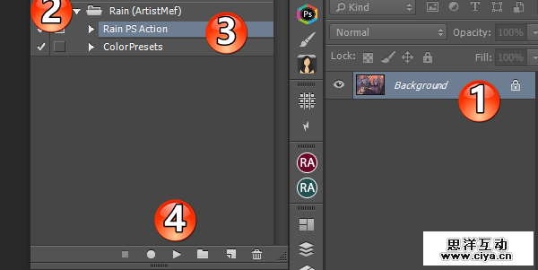 第三步,准备动作。接下来就是把刚才复制粘贴过的动作预设调入到动作面板,如果没有在PS工作区找到动作面板的,可以通过菜单栏“窗口>动作”调出,或者直接按Alt+F9。然后,如图所示,点击面板上下文面板,选择“Rain Photoshop Action (ArtistMef)”载入到面板。