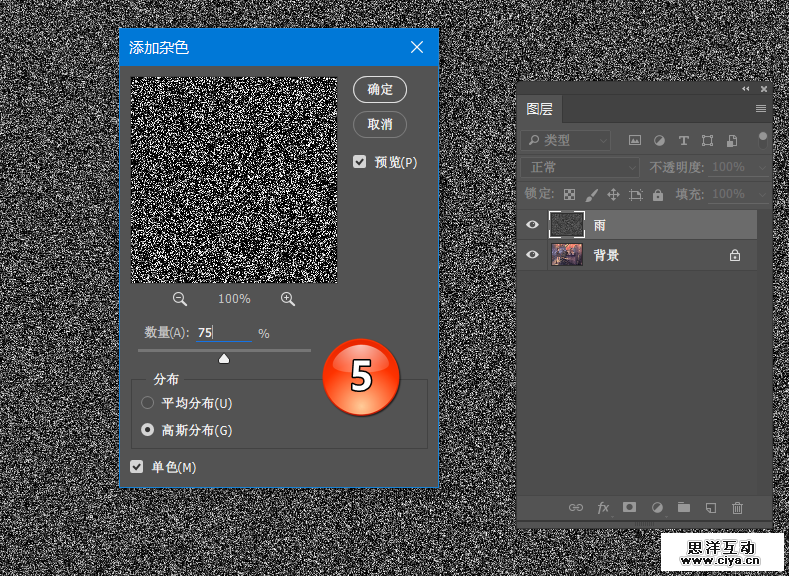 第三步,对图层雨进行一系列的滤镜操作。选择菜单滤镜>杂色>添加杂色,如下图所示设置杂色参数,点击确定。