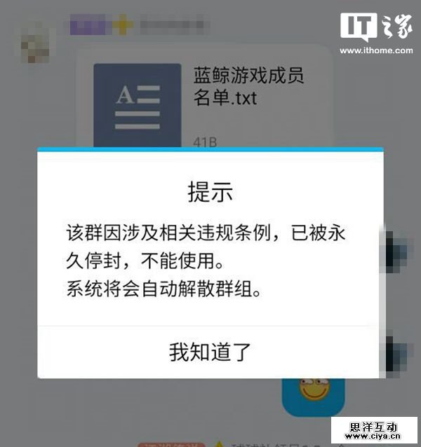 今天上午据多位网友爆料称,腾讯加大了对于QQ群蓝鲸相关内容的封杀范围,当用户在群文件当中上传一个蓝鲸标题的文档并举报便会秒封QQ群,这也导致了不少误封的情况出现。