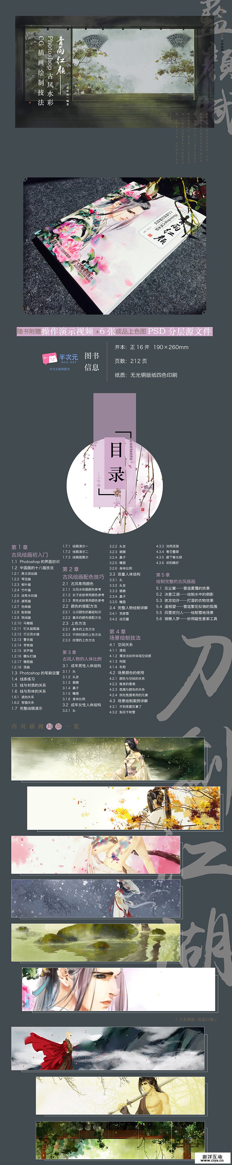本书共分为5章,第1章带领读者学习了Photoshop的软件基础知识;第2章详细讲解了古风插画的用线知识;第3章展示了多种材质和画面的上色方法。由于场景和人物是画面构成必不可缺的两个要素,因此也是本书的重点;第4~5章使用理论结合案例的方法,带领读者学习了人物和场景的绘制过程。作者将自己的绘画经验倾囊相授,意图让读者在绘画时学会思考,总结出自己的独到画法。释放自己的情绪,去感悟画中那人、那景给世人展示的故事。本书适合绘画爱好者、数字绘画初学者阅读和使用。