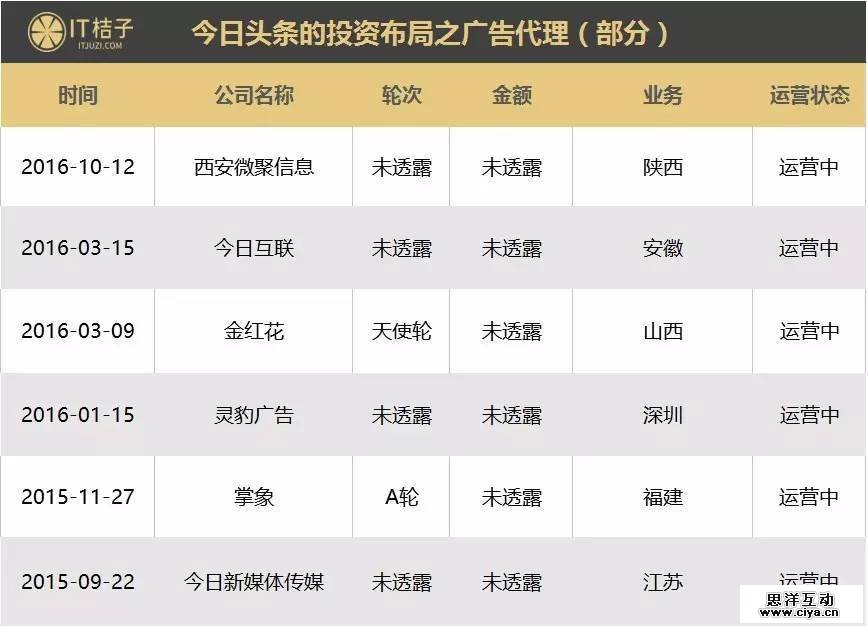 今日头条的一个重点投资布局领域是在广告业务方面。IT 桔子发现今日头条正在全国投资布局广告营销业务的代理合作商。