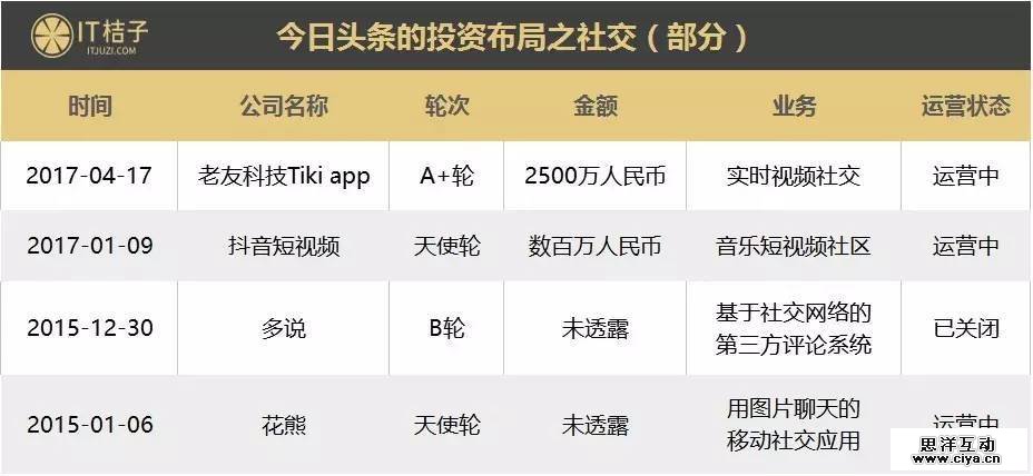 42 章经的曲凯在《头条的发家与困局》一文中也提到「社交关系是最强的留存。所以头条内部孵化了诸如内涵段子、抖音等很多产品,而外部也投资了很多初创公司。」这些外部投资的公司有老友科技 Tiki app、花熊、Vshow 我秀时代、Flipagram 等,都是具有社交属性的产品。