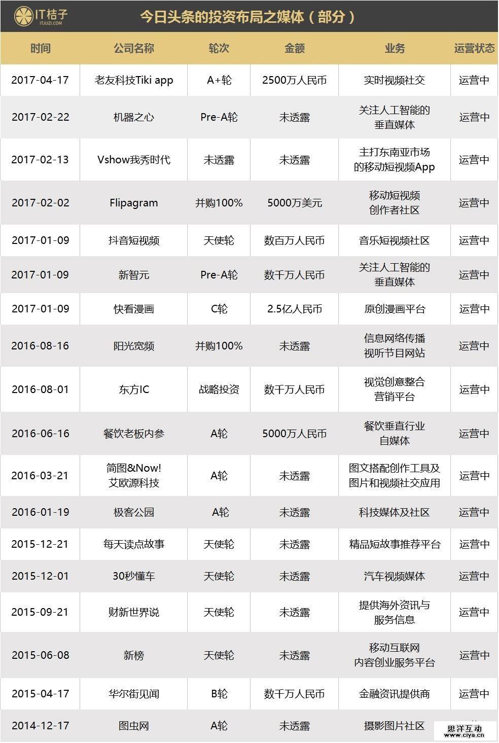 今日头条从 2014 年底开始,相继投资了图虫网(摄影图片社区)、华尔街见闻(金融资讯提供商)、新榜(移动互联网内容创业服务平台)、财新世界说(与财新传媒联合孵化的基于国别的全球资讯媒体平台)、30 秒懂车(汽车视频媒体平台)、每天读点故事(精品短故事推荐平台)、极客公园(科技媒体及社区)、餐饮老板内参(餐饮垂直行业自媒体)、东方 IC(视觉创意整合营销平台)、花熊和快看漫画(动漫领域)、新智元和机器之心(关注人工智能领域的垂直媒体)以及短视频领域的 Vshow 我秀时代、Flipagram、抖音短视频、火山小视频等。