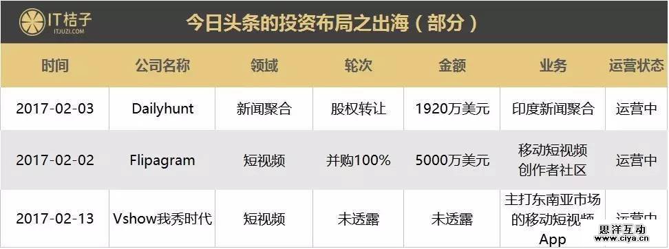 此后今日头条相继投资并购了印度新闻聚合平台 Dailyhunt、美国移动短视频创作者社区 Flipagram、主打东南亚市场的移动短视频 App Vshow 我秀时代等。