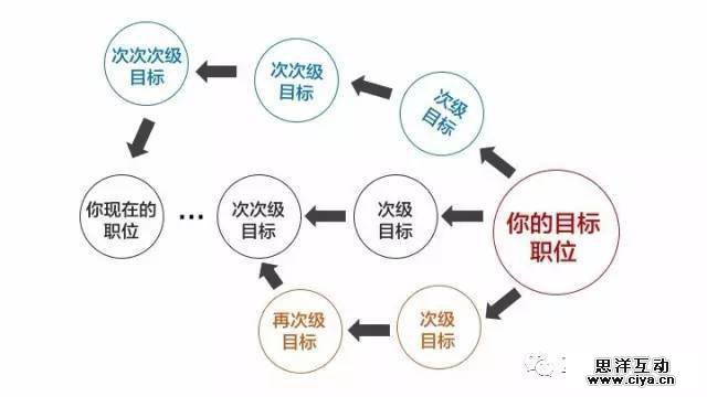 即从你的目标开始,依次往前倒推。比如你的终极目标是成为知名公司A的市场总监,那么倒推找到这个目标的次级目标,即你要先成为一名在A公司或比A公司相对名气小一点的B公司的市场经理;再往回推一个目标,即你要更先成为一名在B公司或比B公司相对名气小一点的C公司的市场执行...每一次倒推都在公司名声,专业度,行业影响力,发展潜力,薪资水平等方面降低一个或半个等级,直到推演到你现在的职位为止。这个规划方法的优势在于,始终以目标为出发点,围绕着目标去不断进行拆解,从而找到最适合现在的努力方向。