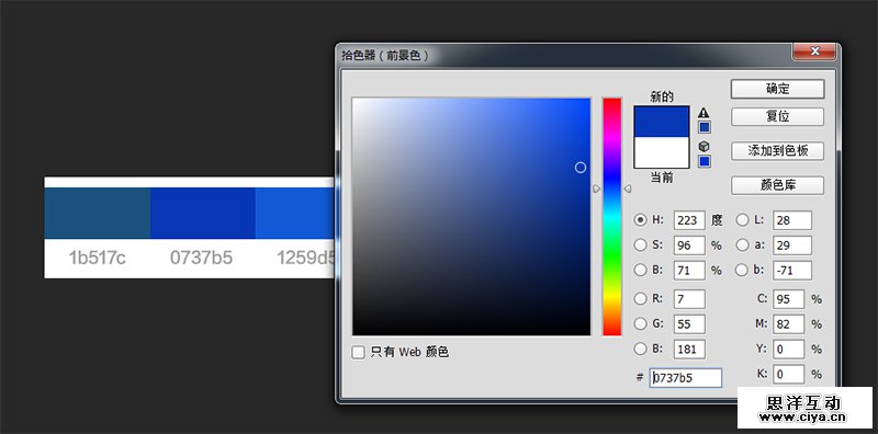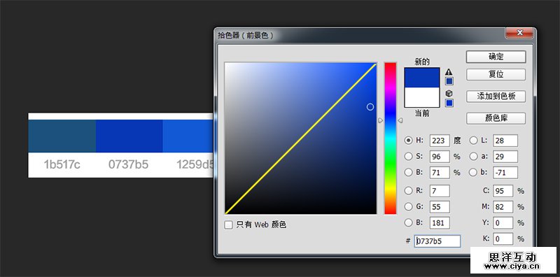 我们以#0737b5这个颜为例。为了便于大家理解,我在取色器画了一条线,这条线的左边色彩偏亮,右边偏暗。以这条线为准,越往右色彩就会越脏,所以提纯最主要的是我们要把色彩往左边提,增加色彩的明度(如图7)。