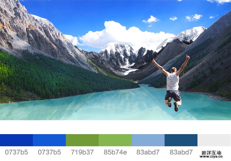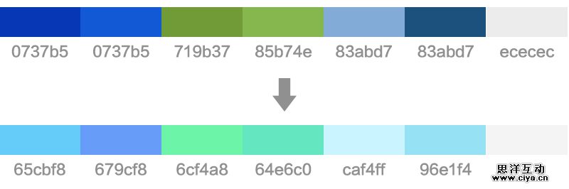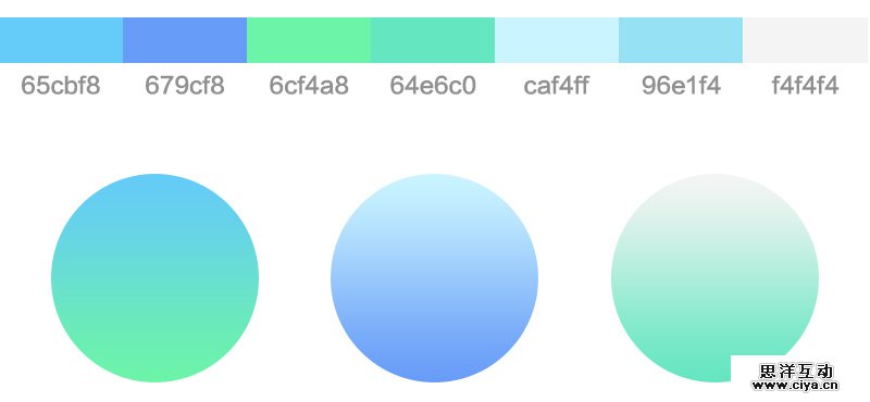 我通过吸取图片中颜色得出一组蓝色和绿色的组合。组合必须达到两点要求:一是颜色之间要和谐;二是必须有亮色有暗色,因为界面中既有背景也有文字,所以必须明暗上拉开差距,才能保证阅读。