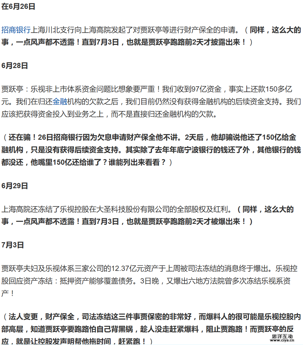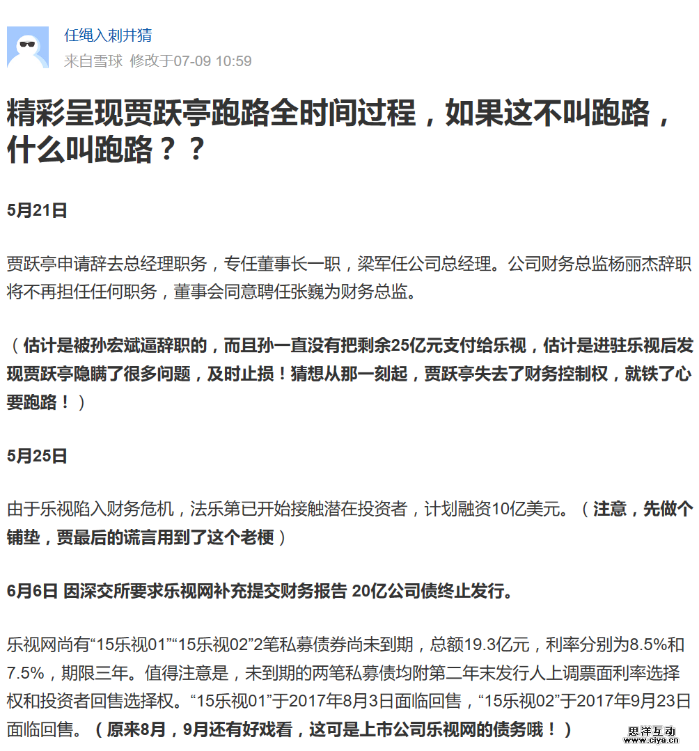 7月9日,雪球上一位叫“任绳入刺井猜”的网友在题为《精彩呈现贾跃亭跑路全时间过程,如果这不叫跑路,什么叫跑路??》的帖子下面梳理了从今年5月21日开始,这不到2个月的时间,贾跃亭是如何上演一出“超级跑路”大戏的。虎嗅截屏如下: