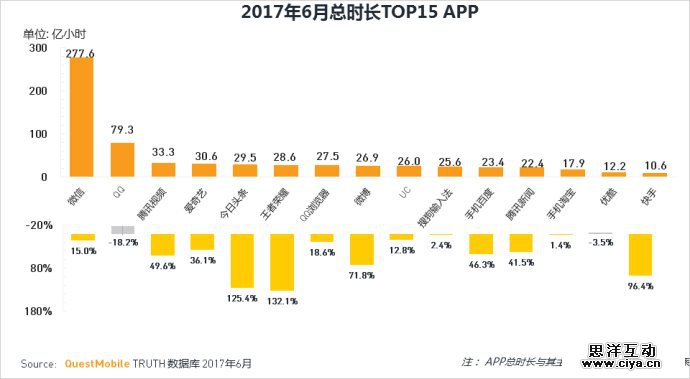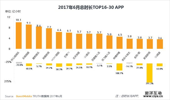 此外,报告还分析了 2017 年 6 月份总时长APP使用排名,微信、QQ分别位居第一第二名。王者荣耀,今日头条,快手,哔哩哔哩及新浪新闻的总时长同比增长亮眼,以下是 6 月总时长TOP30APP