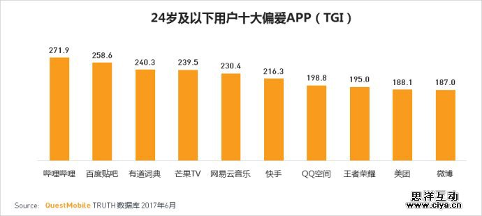 数据显示, 6 月份最受 24 岁及以下年轻用户偏爱的十大APP分别是:哔哩哔哩,百度贴吧,有道词典,芒果TV,网易云音乐,快手,QQ空间,王者荣耀,美团,微博。