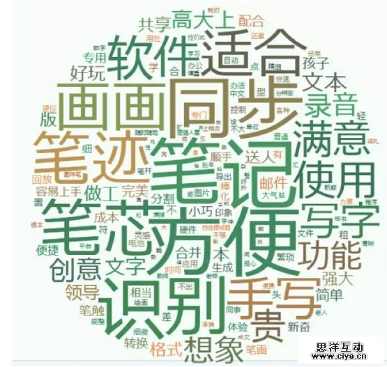 这些被提取出的关键词浓缩了用户舆情中的精华信息,能反映出用户的关注点、情绪和认知,产品的潜在竞争力等信息。例如,在网易100分的智能笔用户需求调研项目中,我们针对2C市场的智能笔消费者进行了舆情分析。首先我们通过ROST的分词工具获取了分词文档,关键词及其词频列表。然后我们将分词后的文档导入在线词云编辑器Tagxedo,就能直接生成词云图。