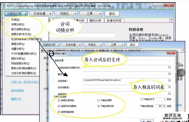 包括分词、过滤停用词、统计高频词在内的这些操作,都可以通过ROST的分词工具完成。我们可以在ROST中导入经过完善或自定义的词库词表,替换掉ROST自带的默认词库。