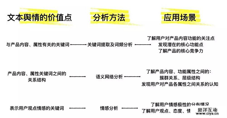 当我们从电商、论坛、应用市场、新闻媒介等渠道平台取到大量和调研目标相匹配的用户舆情文本后,具体应该如何应用?其中可能包含哪些对用研有价值的内容?可以通过什么方法提炼分析?能实现什么预期效果?根据以往项目经验,文本舆情分析的价值和具体应用如下图所示: