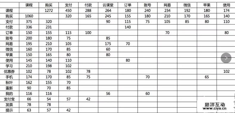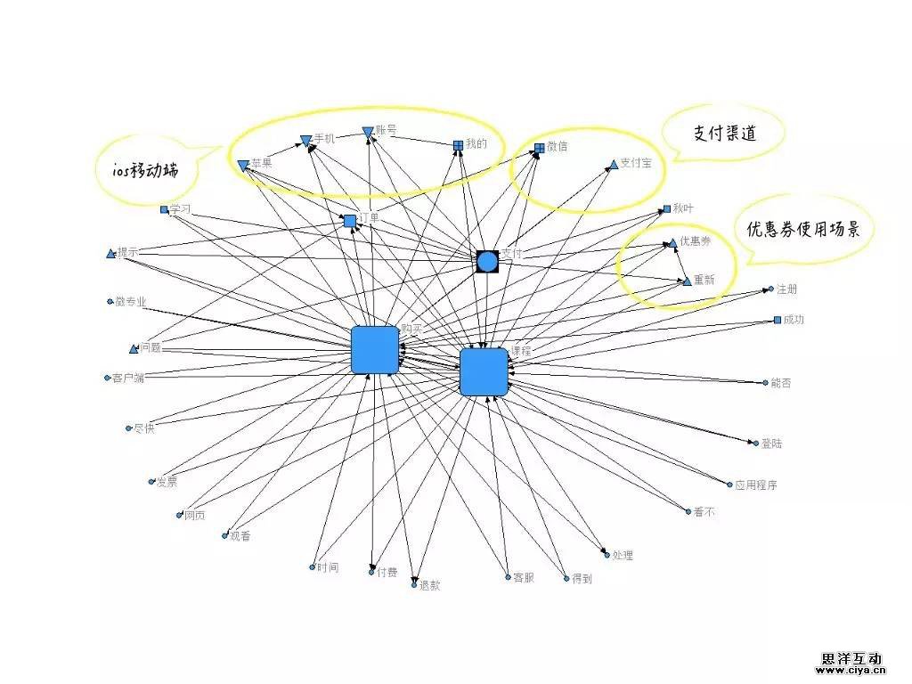 例如,我们曾针对网易云课堂的用户支付问题进行了舆情分析。所有舆情数据是以若干支付相关的词汇为关键词,进行抓取的。通过ROST的分析生成了如下图所示的语义网络结构图。