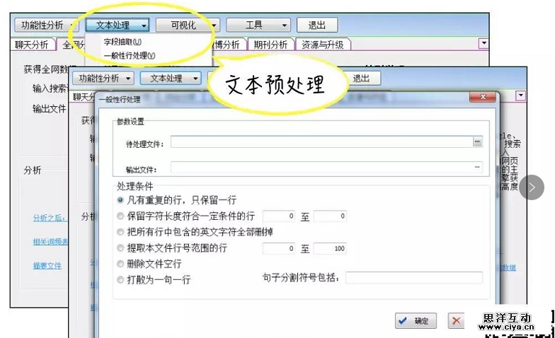 用户在网络上的书写表达非常随意多样,汉字中夹杂数字、字母、符号;语句段落的表达间断不完整,还会出现大量重复的短语短句,比如有的人会评论“棒棒棒棒”“太太太太差了“。文本清洗首要是把这些噪音数据清洗掉。ROST的“文本处理”功能可以用来进行文本清洗。
