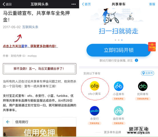 阿里系在去年11月就尝试用芝麻信用“免押金”与杭州本土创业项目骑呗单车合作;今年3月份“永安行”A轮融资中领投方是蚂蚁金服(阿里巴巴);5月初ofo、永安行、小蓝、优拜单车、由你单车等共享单车入驻支付宝“扫一扫”,新用户以芝麻信用免押金或者减押金,笔者打开支付宝的频次明显增加。