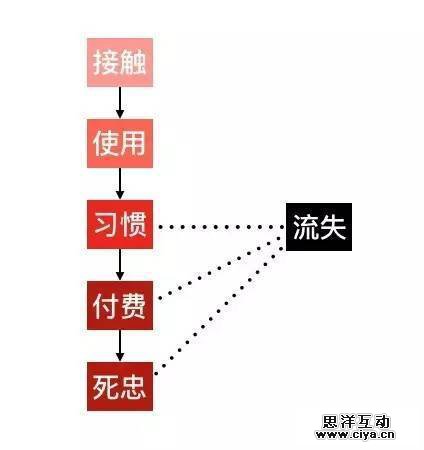 同样,用户的生命周期也可以分为五个阶段:接触,使用,习惯,付费,死忠。同时后三个阶段的用户可能随时会进入运营最不想看到的状态——流失。